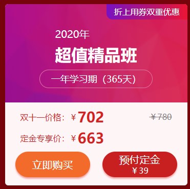2020年傳統(tǒng)中醫(yī)師承和確有專長考試超值精品班低至85折!最低643元即可購買2020年傳統(tǒng)中醫(yī)師承和確有專長考試超值精品班,怎么這么優(yōu)惠?不用質(zhì)疑!2020年醫(yī)學(xué)教育網(wǎng)“爽十一”活動(dòng)上線啦!給大家實(shí)實(shí)在在的優(yōu)惠,計(jì)算各種組合優(yōu)惠心累?醫(yī)學(xué)教育網(wǎng)編輯為大家算好了,直接購買就最劃算!