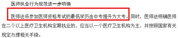 醫(yī)師法將參加醫(yī)師資格考試的最低學(xué)歷由中專提升為大專。同時,醫(yī)師法明確醫(yī)師在二個以上醫(yī)療衛(wèi)生機構(gòu)定期執(zhí)業(yè)的,應(yīng)當(dāng)以一個醫(yī)療衛(wèi)生機構(gòu)為主,并按照國家有關(guān)規(guī)定辦理相關(guān)手續(xù)。