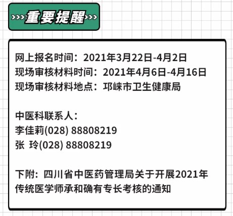 成都市邛崍市2021年傳統(tǒng)師承考試報(bào)名3月22日起!醫(yī)學(xué)教育網(wǎng)編輯幫您整理2021年成都市邛崍市傳統(tǒng)師承考試報(bào)名提醒內(nèi)容如下。