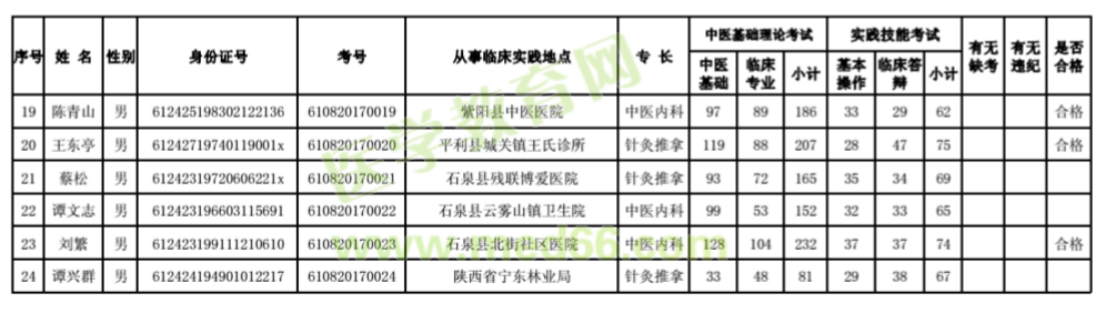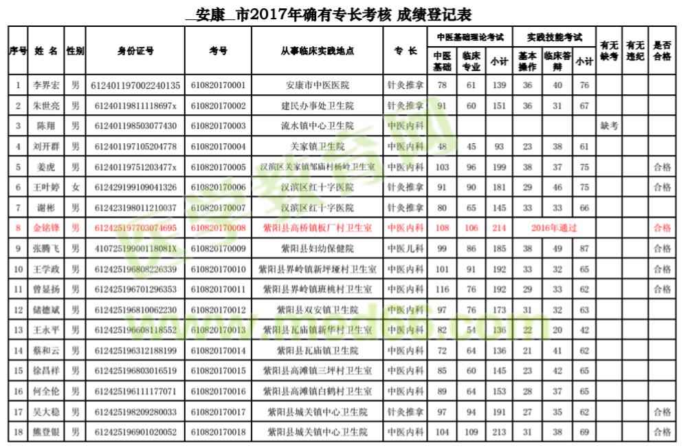 根據(jù)《陜西省中醫(yī)藥管理局關(guān)于進(jìn)行2017年傳統(tǒng)醫(yī)學(xué)出師考核和確有專長考核通知》(陜中醫(yī)藥發(fā)〔2017〕23號(hào))要求。全省于6月24-25日進(jìn)行了2017年傳統(tǒng)醫(yī)學(xué)確有專長考核,現(xiàn)將安康市確有專長人員醫(yī)師資格考試成績(jī)予以公布。