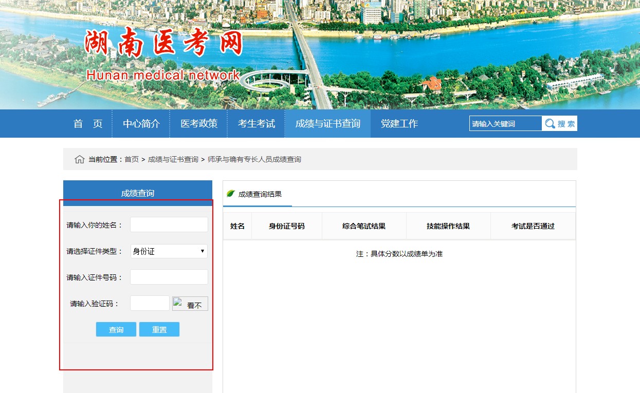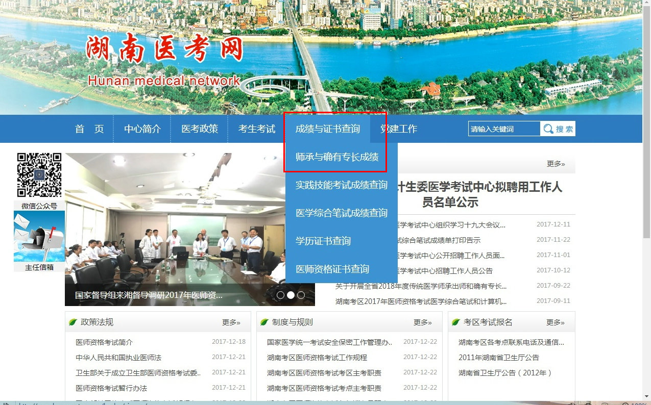 1、點(diǎn)開湖南省醫(yī)考網(wǎng),在導(dǎo)航欄中找到成績(jī)證書與查詢,選擇師承與確有專長(zhǎng)成績(jī)。