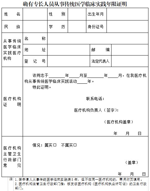 注1.若申請人從事傳統(tǒng)醫(yī)學(xué)臨床實踐滿5年,但不在同一醫(yī)療機構(gòu)的,需另附頁填寫。