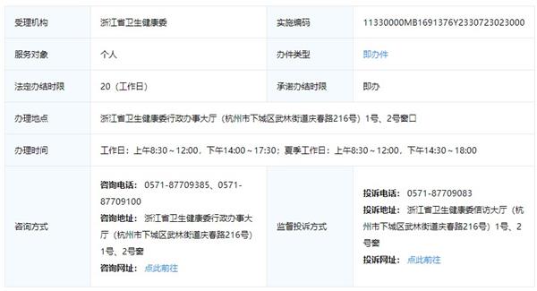 具體地址:浙江省衛(wèi)生健康委行政辦事大廳(杭州市下城區(qū)武林街道慶春路216號)1號、2號窗口