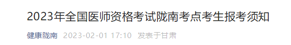 依據(jù)《國(guó)家衛(wèi)生健康委員會(huì)醫(yī)師資格考試委員會(huì)公告》(2023年第1號(hào))時(shí)間安排,以及甘肅考區(qū)2023年全國(guó)醫(yī)師資格考試考生報(bào)考須知,現(xiàn)將隴南考點(diǎn)考生報(bào)名有關(guān)事項(xiàng)通知如下: