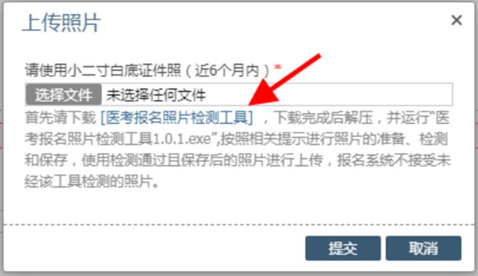 (一)考生在網(wǎng)報(bào)系統(tǒng)上傳個(gè)人小二寸白底證件照時(shí),應(yīng)按照系統(tǒng)提示內(nèi)容下載并運(yùn)行“醫(yī)考報(bào)名照片檢測(cè)工具”,網(wǎng)報(bào)系統(tǒng)只接受經(jīng)該工具檢測(cè)通過(guò)且保存后的照片進(jìn)行上傳。