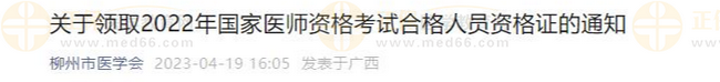 廣西考區(qū)柳州考點(diǎn)2022年醫(yī)師資格證書(shū)領(lǐng)取時(shí)間通知