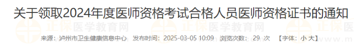 四川瀘州考點2024年中醫(yī)執(zhí)業(yè)醫(yī)師資格證書領取時間與地點