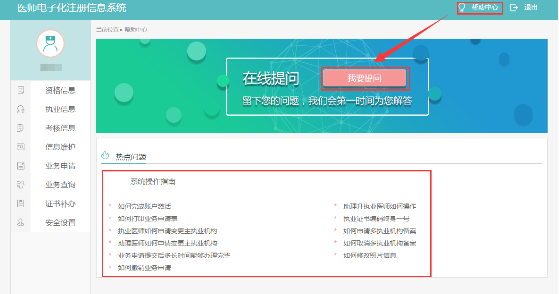 醫(yī)師個人如果在使用系統(tǒng)時遇到了問題,請點擊右上角“幫助中心”,首先查看下方熱點問題,如果還不能解決問題,您可以點擊“我要提問”,將問題描述清楚后提交。