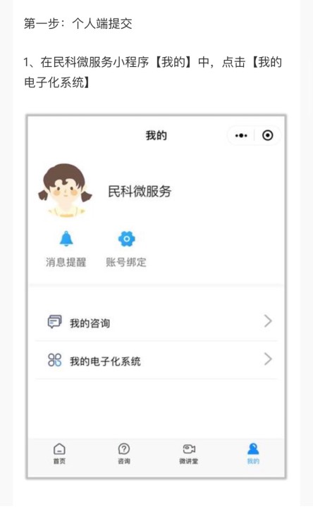電子化注冊入口(手機端):微信搜索“民科微服務小程序”。