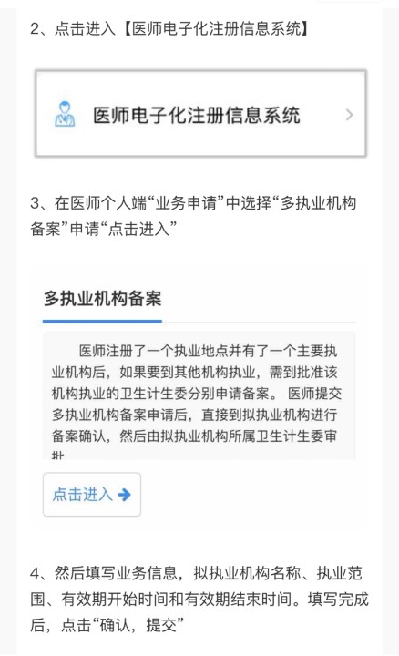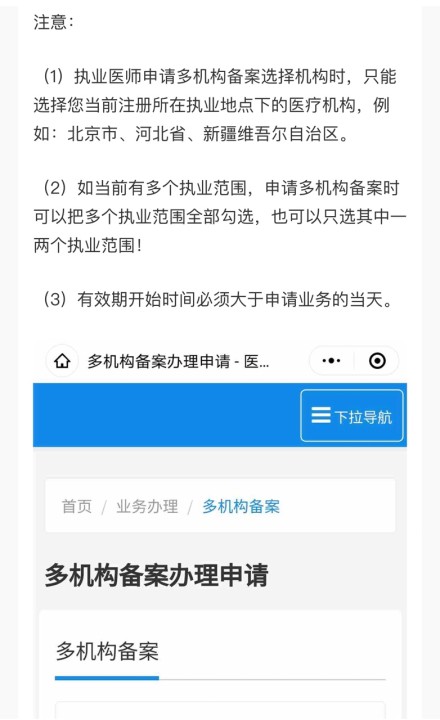 (1)執(zhí)業(yè)醫(yī)師不能跨省多執(zhí)業(yè)機構(gòu)備案。如果要在其他執(zhí)業(yè)地點(其他省份)申請多執(zhí)業(yè)機構(gòu)備案,首先需要在擬執(zhí)業(yè)的省份先申請一個主執(zhí)業(yè)機構(gòu)“注冊”信息,然后再在該有效執(zhí)業(yè)注冊信息的基礎(chǔ)上申請新的多執(zhí)業(yè)機構(gòu)備案。