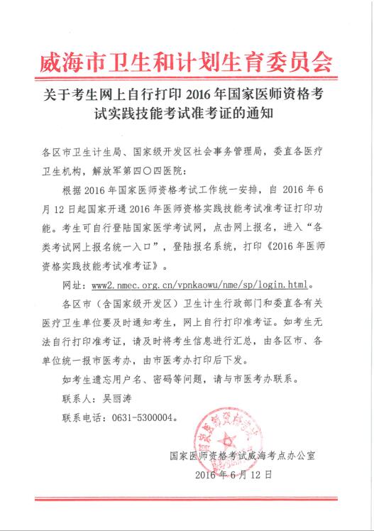按照國(guó)家衛(wèi)生和計(jì)劃生育委員會(huì)中醫(yī)執(zhí)業(yè)醫(yī)師資格考試委員會(huì)公告(2016第01號(hào))要求,現(xiàn)就2016年中醫(yī)執(zhí)業(yè)醫(yī)師資格考試(山東威??紖^(qū))準(zhǔn)考證打印工作提出如下通知: