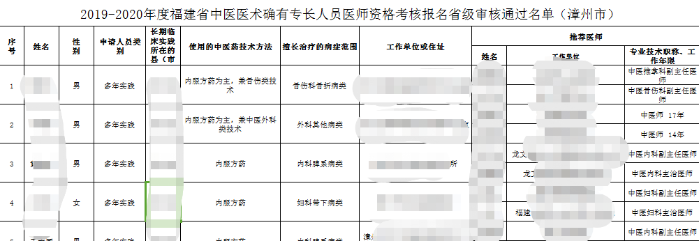 根據(jù)《福建省中醫(yī)醫(yī)術(shù)確有專長人員醫(yī)師資格考核注冊管理實施細則(試行)》(閩衛(wèi)中〔2018〕828號)和《福建省中醫(yī)醫(yī)術(shù)確有專長人員醫(yī)師資格考務(wù)管理辦法》(閩衛(wèi)中醫(yī)函〔2019〕458號)規(guī)定,福建省衛(wèi)健委于2019年11月啟動2019-2020年度福建省中醫(yī)醫(yī)術(shù)確有專長人員醫(yī)師資格考核報名工作。經(jīng)縣(市、區(qū))級衛(wèi)生健康行政部門組織報名及初審,設(shè)區(qū)市級、省級衛(wèi)生健康行政部門逐級復(fù)審,共有1364名中醫(yī)醫(yī)術(shù)確有專長人員符合考核條件。按照相關(guān)規(guī)定,現(xiàn)將符合考核條件的中醫(yī)醫(yī)術(shù)確有專長人員、指導(dǎo)老師和推薦醫(yī)師信息在省內(nèi)公示,接受社會各界監(jiān)督,公示期從2021年1月7日至1月13日。公示期間對公示信息如有異議,請實名向福建省衛(wèi)健委反映(聯(lián)系電話:0591-87833674,郵寄地址:福州市鼓屏路61號,福建省衛(wèi)健委中醫(yī)處收,信函以寄出日郵戳為準(zhǔn))。