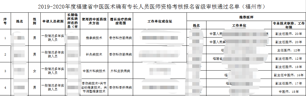 根據(jù)《福建省中醫(yī)醫(yī)術(shù)確有專長人員醫(yī)師資格考核注冊管理實施細則(試行)》(閩衛(wèi)中〔2018〕828號)和《福建省中醫(yī)醫(yī)術(shù)確有專長人員醫(yī)師資格考務(wù)管理辦法》(閩衛(wèi)中醫(yī)函〔2019〕458號)規(guī)定,福建省衛(wèi)健委于2019年11月啟動2019-2020年度福建省中醫(yī)醫(yī)術(shù)確有專長人員醫(yī)師資格考核報名工作。經(jīng)縣(市、區(qū))級衛(wèi)生健康行政部門組織報名及初審,設(shè)區(qū)市級、省級衛(wèi)生健康行政部門逐級復(fù)審,共有1364名中醫(yī)醫(yī)術(shù)確有專長人員符合考核條件。按照相關(guān)規(guī)定,現(xiàn)將符合考核條件的中醫(yī)醫(yī)術(shù)確有專長人員、指導(dǎo)老師和推薦醫(yī)師信息在省內(nèi)公示,接受社會各界監(jiān)督,公示期從2021年1月7日至1月13日。公示期間對公示信息如有異議,請實名向福建省衛(wèi)健委反映(聯(lián)系電話:0591-87833674,郵寄地址:福州市鼓屏路61號,福建省衛(wèi)健委中醫(yī)處收,信函以寄出日郵戳為準)。