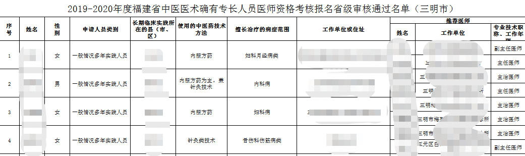 根據(jù)《福建省中醫(yī)醫(yī)術(shù)確有專(zhuān)長(zhǎng)人員醫(yī)師資格考核注冊(cè)管理實(shí)施細(xì)則(試行)》(閩衛(wèi)中〔2018〕828號(hào))和《福建省中醫(yī)醫(yī)術(shù)確有專(zhuān)長(zhǎng)人員醫(yī)師資格考務(wù)管理辦法》(閩衛(wèi)中醫(yī)函〔2019〕458號(hào))規(guī)定,福建省衛(wèi)健委于2019年11月啟動(dòng)2019-2020年度福建省中醫(yī)醫(yī)術(shù)確有專(zhuān)長(zhǎng)人員醫(yī)師資格考核報(bào)名工作。經(jīng)縣(市、區(qū))級(jí)衛(wèi)生健康行政部門(mén)組織報(bào)名及初審,設(shè)區(qū)市級(jí)、省級(jí)衛(wèi)生健康行政部門(mén)逐級(jí)復(fù)審,共有1364名中醫(yī)醫(yī)術(shù)確有專(zhuān)長(zhǎng)人員符合考核條件。按照相關(guān)規(guī)定,現(xiàn)將符合考核條件的中醫(yī)醫(yī)術(shù)確有專(zhuān)長(zhǎng)人員、指導(dǎo)老師和推薦醫(yī)師信息在省內(nèi)公示,接受社會(huì)各界監(jiān)督,公示期從2021年1月7日至1月13日。公示期間對(duì)公示信息如有異議,請(qǐng)實(shí)名向福建省衛(wèi)健委反映(聯(lián)系電話:0591-87833674,郵寄地址:福州市鼓屏路61號(hào),福建省衛(wèi)健委中醫(yī)處收,信函以寄出日郵戳為準(zhǔn))。