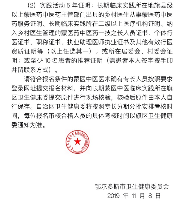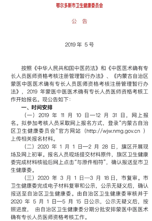 關(guān)于“鄂爾多斯市衛(wèi)健委發(fā)布關(guān)于蒙中醫(yī)醫(yī)術(shù)確有專長考核工作公告”相關(guān)內(nèi)容,相信報考鄂爾多斯市中醫(yī)醫(yī)術(shù)確有專長人員醫(yī)師資格考核考試的考生都想知道, 為幫助大家了解,在此醫(yī)學(xué)教育網(wǎng)小編為大家整理如下內(nèi)容: