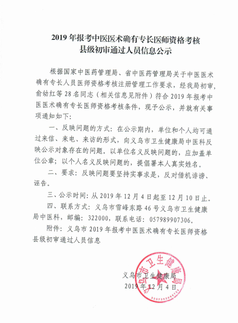 義烏市2019年報(bào)考中醫(yī)醫(yī)術(shù)確有專長醫(yī)師資格考核縣級初審?fù)ㄟ^人員信息公示