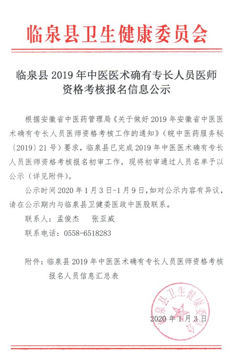 安徽省阜陽市臨泉縣衛(wèi)健委發(fā)布阜陽市臨泉縣2019年中醫(yī)醫(yī)術(shù)確有專長(zhǎng)人員醫(yī)師資格考核報(bào)名人員信息匯總表,為幫助大家了解,在此醫(yī)學(xué)教育網(wǎng)小編為大家整理如下內(nèi)容: