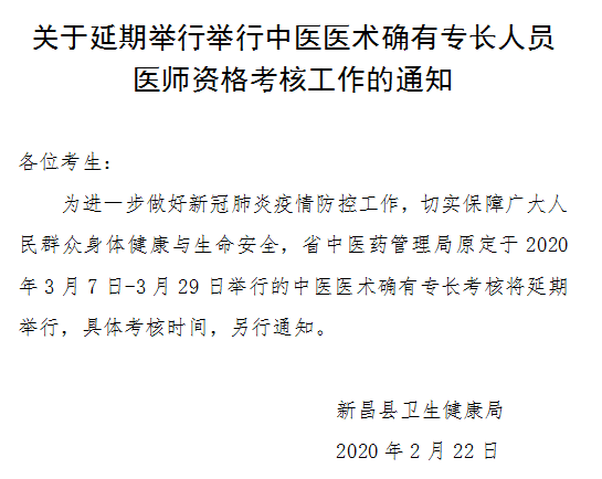 關(guān)于延期舉行舉行中醫(yī)醫(yī)術(shù)確有專長人員醫(yī)師資格考核工作的通知