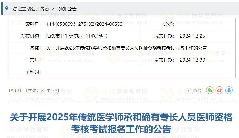 廣東省汕頭市2025年傳統(tǒng)醫(yī)學師承和確有專長人員醫(yī)師資格考核考試報名公告已發(fā)布,報名時間即日至2025年3月25日,醫(yī)學教育網(wǎng)小編整理官方通知如下:
