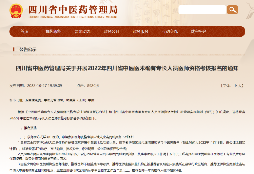 關(guān)于開(kāi)展2022年四川省各地中醫(yī)醫(yī)術(shù)確有專長(zhǎng)人員醫(yī)師資格考核報(bào)名的通知