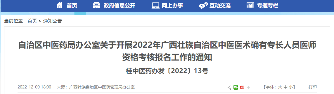 關(guān)于開展2022年廣西壯族自治區(qū)中醫(yī)醫(yī)術(shù)確有專長人員醫(yī)師資格考核報名工作的通知