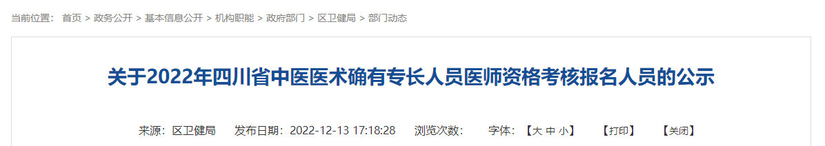 根據(jù)《四川省中醫(yī)藥管理局關(guān)于開展2022年四川省中醫(yī)醫(yī)術(shù)確有專長(zhǎng)人員醫(yī)師資格考核報(bào)名的通知》和《四川省中醫(yī)醫(yī)術(shù)確有專長(zhǎng)人員醫(yī)師資格考核注冊(cè)管理實(shí)施細(xì)則(暫行)》的規(guī)定,現(xiàn)對(duì)我區(qū)2名2022年中醫(yī)醫(yī)術(shù)確有專長(zhǎng)人員醫(yī)師資格考核報(bào)名人員信息予以公示(詳見附件),公示時(shí)間為2022年12月14日至12月22日。廣大群眾如有異議,請(qǐng)?jiān)诠局掌?個(gè)工作日內(nèi)向龍泉驛區(qū)衛(wèi)生健康局中醫(yī)科反映。