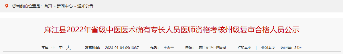 根據貴州省中醫(yī)藥管理局《2022年貴州省中醫(yī)醫(yī)術確有專長人員醫(yī)師資格考核通告》要求,經縣級報名、初審和州級復審,麻江縣2022年省級中醫(yī)醫(yī)術確有專長人員醫(yī)師資格考核合格4人,現予以公示,公示時間為:2023年1月3日至1月11日,公示期內如對公示結果有異議的,可向縣衛(wèi)生健康局中醫(yī)民族醫(yī)藥管理科反映情況。