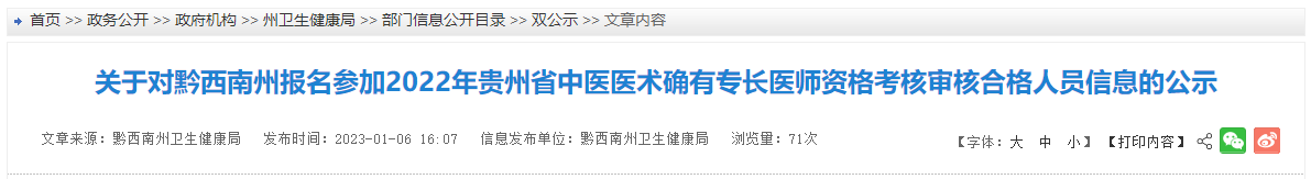 黔西南州衛(wèi)生健康局發(fā)布關(guān)于對黔西南州報名參加2022年貴州省中醫(yī)醫(yī)術(shù)確有專長醫(yī)師資格考核審核合格人員信息的公示,希望對考生有所幫助!
