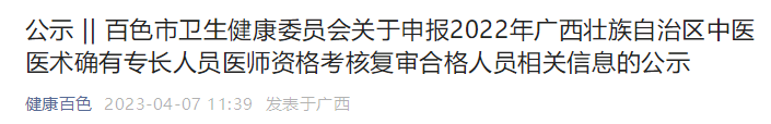 河池市衛(wèi)生健康委員會關(guān)于對2022年中醫(yī)醫(yī)術(shù)確有專長人員醫(yī)師資格考核報(bào)名審核通過人員名單的公示