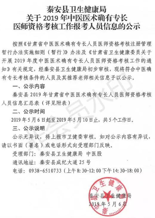 秦安縣2019中醫(yī)醫(yī)術(shù)確有專長醫(yī)師資格考核工作報考人員信息公示名單已發(fā)布,醫(yī)學教育網(wǎng)編輯為您整理秦安縣2019中醫(yī)醫(yī)術(shù)確有專長醫(yī)師資格考核工作報考人員信息公示名單信息如下。