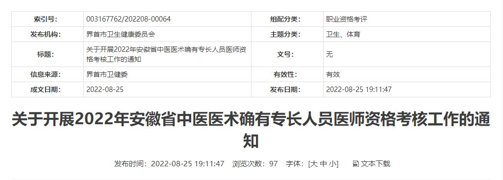 根據(jù)《中華人民共和國中醫(yī)藥法》《中醫(yī)醫(yī)術(shù)確有專長人員醫(yī)師資格考核注冊管理暫行辦法》《安徽省中醫(yī)醫(yī)術(shù)確有專長人員醫(yī)師資格考核注冊管理實施細則(試行)》《2022年安徽省中醫(yī)醫(yī)術(shù)確有專長人員醫(yī)師資格考核公告》規(guī)定,現(xiàn)就2022年安徽省中醫(yī)醫(yī)術(shù)確有專長人員醫(yī)師資格考核有關(guān)事項通知如下: