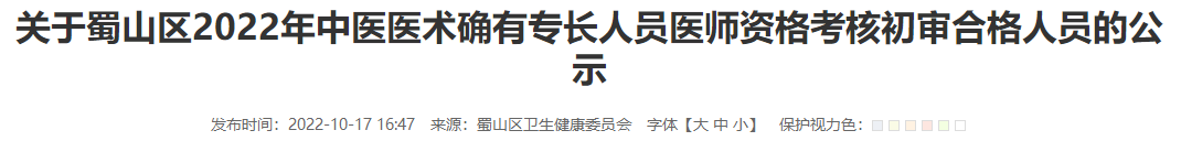 原文標(biāo)題:關(guān)于蜀山區(qū)2022年中醫(yī)醫(yī)術(shù)確有專(zhuān)長(zhǎng)人員醫(yī)師資格考核初審合格人員的公示