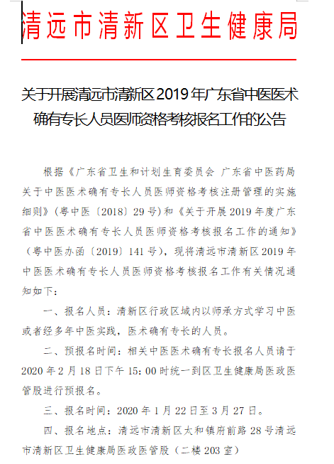 2019年廣東清遠(yuǎn)清新區(qū)中醫(yī)醫(yī)術(shù)確有專長人員醫(yī)師資格考核工作的通知,具體內(nèi)容醫(yī)學(xué)教育網(wǎng)整理如下:
