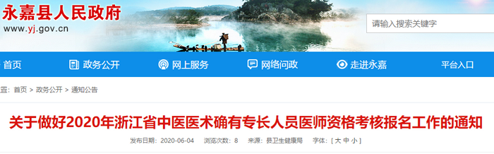 永嘉縣衛(wèi)生局發(fā)布2020年溫州市永嘉縣中醫(yī)(專長)醫(yī)師資格考核報名工作的通知,具體通知內(nèi)容醫(yī)學教育網(wǎng)整理如下: