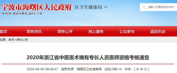 寧波市海曙區(qū)2020中醫(yī)醫(yī)術(shù)確有專(zhuān)長(zhǎng)人員醫(yī)師資格考核報(bào)名通知,具體內(nèi)容醫(yī)學(xué)教育網(wǎng)小編搜集整理如下: