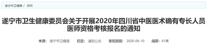 遂寧市衛(wèi)健委轉(zhuǎn)發(fā)四川省2020中醫(yī)(專長(zhǎng))醫(yī)師資格考核報(bào)名的通知,具體通知內(nèi)容醫(yī)學(xué)教育網(wǎng)小編搜集整理如下: