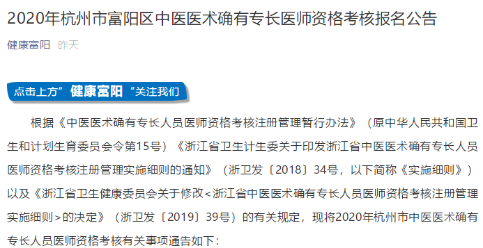 “杭州市富陽區(qū)2020年中醫(yī)醫(yī)術(shù)確有專長醫(yī)師資格考核報(bào)名的通知”的內(nèi)容很多人都想知道,醫(yī)學(xué)教育網(wǎng)小編為此整理了“杭州市富陽區(qū)2020年中醫(yī)醫(yī)術(shù)確有專長醫(yī)師資格考核報(bào)名的通知”,詳情如下: