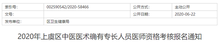 杭州市上虞區(qū)2020年中醫(yī)醫(yī)術(shù)確有專長醫(yī)師資格考核報(bào)名的通知,具體通知內(nèi)容醫(yī)學(xué)教育網(wǎng)小編搜集整理如下: