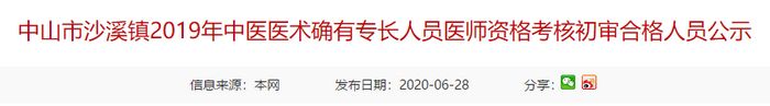 根據(jù)《關(guān)于印發(fā)廣東省衛(wèi)生和計(jì)劃生育委員會(huì)廣東省中醫(yī)藥局關(guān)于中醫(yī)醫(yī)術(shù)確有專長(zhǎng)人員醫(yī)師資格考核注冊(cè)管理的實(shí)施細(xì)則的通知》(粵中醫(yī)〔2018〕29號(hào))和《關(guān)于開展2019年度廣東省中醫(yī)醫(yī)術(shù)確有專長(zhǎng)人員醫(yī)師資格考核報(bào)名工作的通知》(粵中醫(yī)辦函〔2019〕141號(hào))的要求,中山市沙溪鎮(zhèn)于2020年1月13日啟動(dòng)2019年中醫(yī)醫(yī)術(shù)確有專長(zhǎng)人員醫(yī)師資格考核報(bào)名工作。經(jīng)初審,下列考生符合報(bào)考條件,現(xiàn)將考生、推薦醫(yī)師等相關(guān)信息公示如下,公示期5個(gè)工作日(公示期6月28日-7月2日),公示期間如有異議的可向沙溪鎮(zhèn)衛(wèi)計(jì)局反映,聯(lián)系電話:86226631,或者向中山市衛(wèi)生健康局反映,聯(lián)系電話:88360695。
