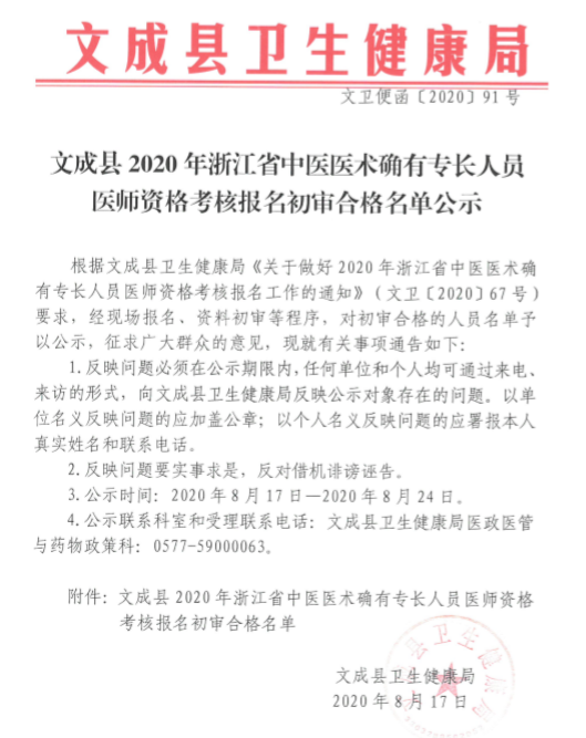 “文成縣2020年浙江省中醫(yī)醫(yī)術(shù)確有專長(zhǎng)人員醫(yī)師資格考核報(bào)名審核通過名單”的內(nèi)容很多人都想知道,醫(yī)學(xué)教育網(wǎng)小編為此整理了“文成縣2020年浙江省中醫(yī)醫(yī)術(shù)確有專長(zhǎng)人員醫(yī)師資格考核報(bào)名審核通過名單”,詳情如下: