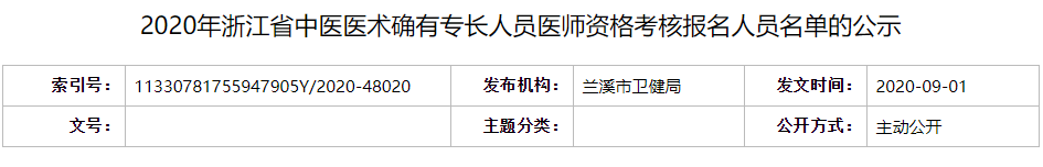 根據(jù)《浙江省中醫(yī)醫(yī)術(shù)確有專長人員醫(yī)師資格考核注冊管理實施細則》(浙衛(wèi)發(fā)〔2018〕34號)和《浙江省中醫(yī)藥管理局關(guān)于做好2020年浙江省中醫(yī)醫(yī)術(shù)確有專長人員醫(yī)師資格考核通告》文件精神,蘭溪市衛(wèi)生健康局于2020年8月10日-21日組織開展蘭溪市中醫(yī)醫(yī)術(shù)確有專長人員醫(yī)師資格考核報名初審工作。經(jīng)蘭溪市衛(wèi)生健康局審核認定,確定董美新等38人通過初審(名單附后),現(xiàn)予以公示,接受社會各界監(jiān)督,公示期為7天,自2020年8月25日起至2020年9月2日止,如對公示人員相關(guān)情況有異議,請實名向蘭溪市衛(wèi)生健康局反映(聯(lián)系電話:0579-88138130,郵寄地址:蘭溪市環(huán)城北路888號蘭溪市衛(wèi)生健康局,郵編321100,信函以寄出日郵戳為準)。