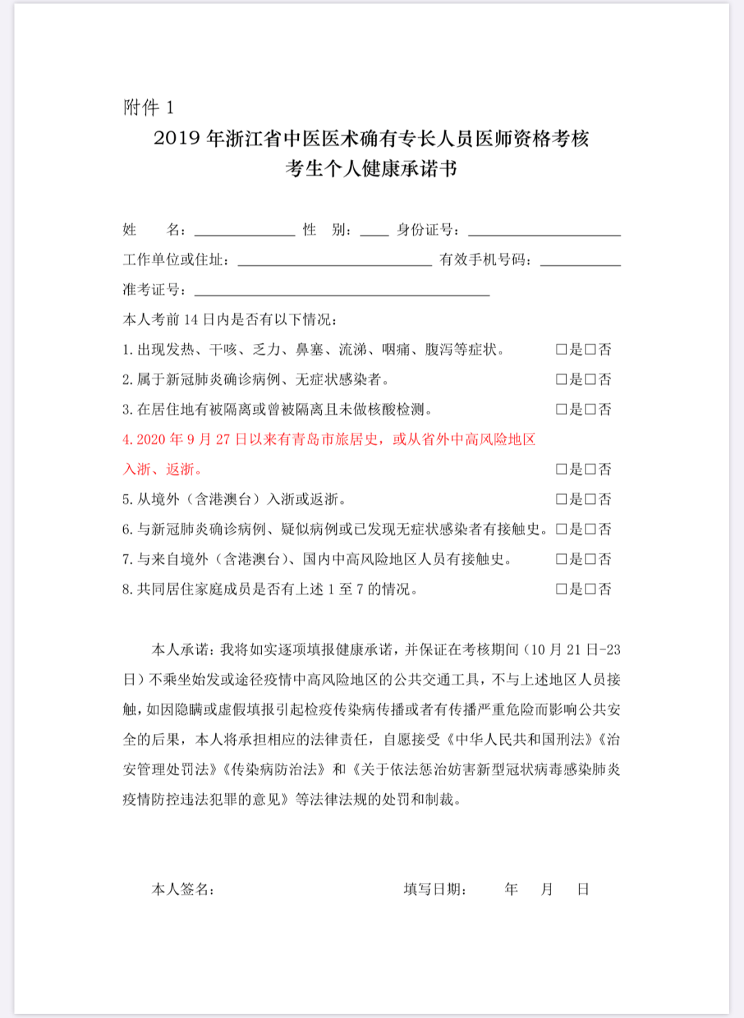 附件:1.2019年浙江省中醫(yī)醫(yī)術(shù)確有專長(zhǎng)人員醫(yī)師資格考核考生個(gè)人健康承諾書