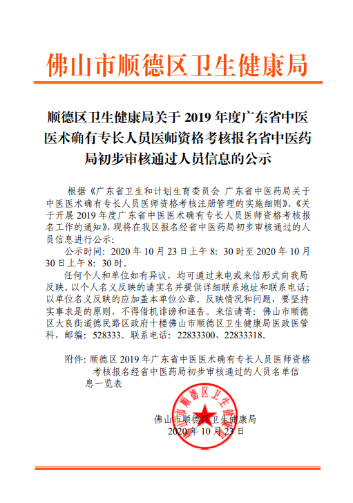 “廣東省佛山市順德區(qū)2019年中醫(yī)醫(yī)術確有專長人員醫(yī)師資格考核報名初審合格名單”的內容很多人都想知道,醫(yī)學教育網小編為此整理了“廣東省佛山市順德區(qū)2019年中醫(yī)醫(yī)術確有專長人員醫(yī)師資格考核報名初審合格名單”,詳情如下: