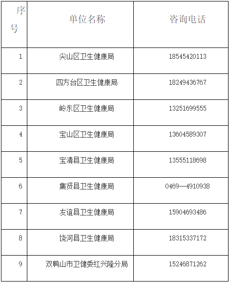 2.雙鴨山市各縣、區(qū)2020年中醫(yī)醫(yī)術(shù)確有專長(zhǎng)人員醫(yī)師資格考核試點(diǎn)政策咨詢方式