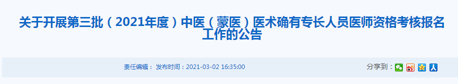 內(nèi)蒙古衛(wèi)健委2021年第13號(hào)公告《中醫(yī)(蒙醫(yī))醫(yī)術(shù)確有專長人員醫(yī)師資格考核報(bào)名公告》