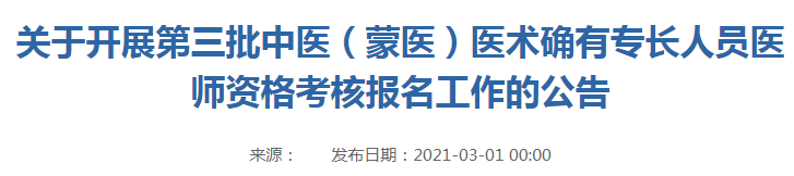 關(guān)于開(kāi)展第三批中醫(yī)(蒙醫(yī))醫(yī)術(shù)確有專(zhuān)長(zhǎng)人員醫(yī)師資格考核報(bào)名工作的公告