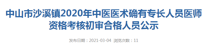 根據(jù)省中醫(yī)藥局《關(guān)于開(kāi)展 2020 年度廣東省中醫(yī)醫(yī)術(shù)確有專(zhuān)長(zhǎng)人員醫(yī)師資格考核報(bào)名工作的通知》(粵中醫(yī)辦函〔2020〕124號(hào))(附件 1)及《關(guān)于印發(fā)廣東省中醫(yī)醫(yī)術(shù)確有專(zhuān)長(zhǎng)人員醫(yī)師資格考核報(bào)名表格(2020 年版)的函》(粵中醫(yī)辦函〔2020〕125號(hào))(附件 2)要求,中山市沙溪鎮(zhèn)于已啟動(dòng)2020年中醫(yī)醫(yī)術(shù)確有專(zhuān)長(zhǎng)人員醫(yī)師資格考核報(bào)名工作。經(jīng)初審,下列考生符合報(bào)考條件,現(xiàn)將考生、推薦醫(yī)師等相關(guān)信息公示如下,公示期5個(gè)工作日(公示期3月4日-3月11日),公示期間如有異議的可向中山市衛(wèi)生健康局沙溪分局反映,聯(lián)系電話:86226631,或者向中山市衛(wèi)生健康局反映,聯(lián)系電話:88360695。