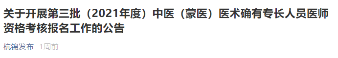 鄂爾多斯市杭錦旗發(fā)布了關(guān)于開展2021年中醫(yī)(蒙醫(yī))醫(yī)術(shù)確有專長(zhǎng)人員醫(yī)師資格考核報(bào)名工作的公告,網(wǎng)上報(bào)名時(shí)間為2021年3月1日—4月30日,具體通知內(nèi)容醫(yī)學(xué)教育網(wǎng)小編搜集整理如下: