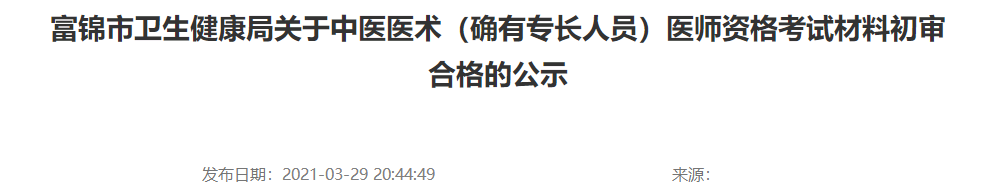 “黑龍江富錦市2020年中醫(yī)醫(yī)術(shù)確有專長人員醫(yī)師資格考核報(bào)名初審合格名單”的內(nèi)容很多人都想知道,醫(yī)學(xué)教育網(wǎng)小編為此整理了“黑龍江富錦市2020年中醫(yī)醫(yī)術(shù)確有專長人員醫(yī)師資格考核報(bào)名初審合格名單”,詳情如下:
