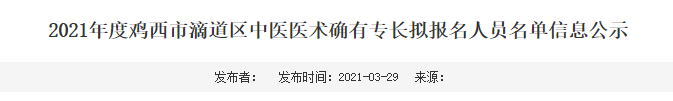 按照《黑龍江省中醫(yī)醫(yī)術(shù)確有專長(zhǎng)人員醫(yī)師資格考核注冊(cè)管理實(shí)施細(xì)則》(黑衛(wèi)中醫(yī)規(guī)發(fā)〔2018〕32號(hào))文件要求,將雞西市滴道區(qū)中醫(yī)醫(yī)術(shù)確有專長(zhǎng)擬報(bào)名人員信息公示如下: